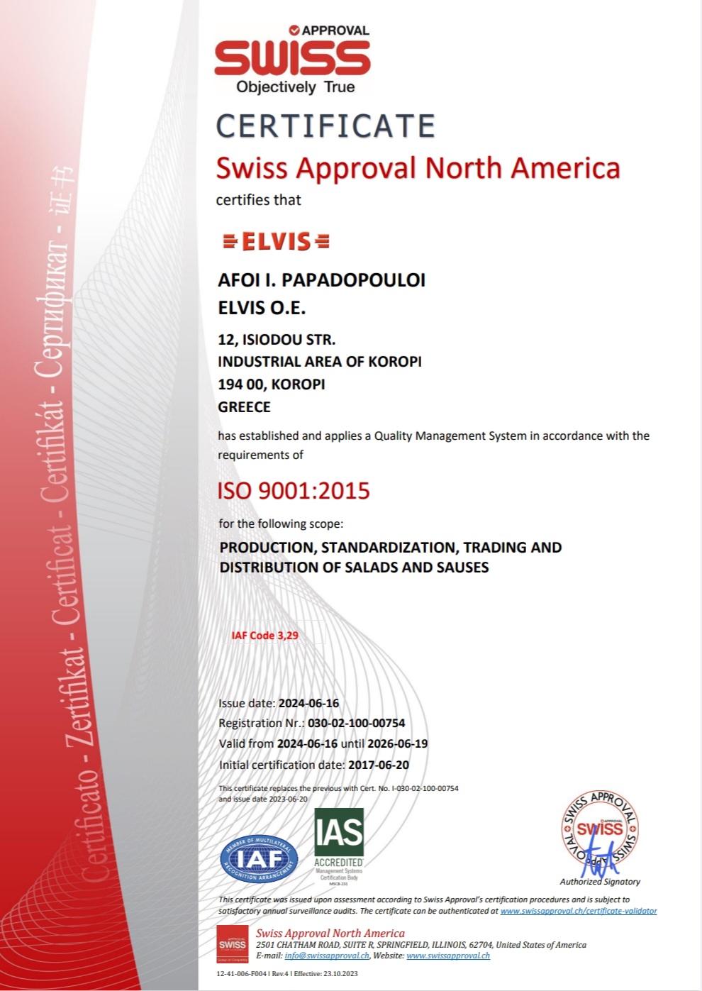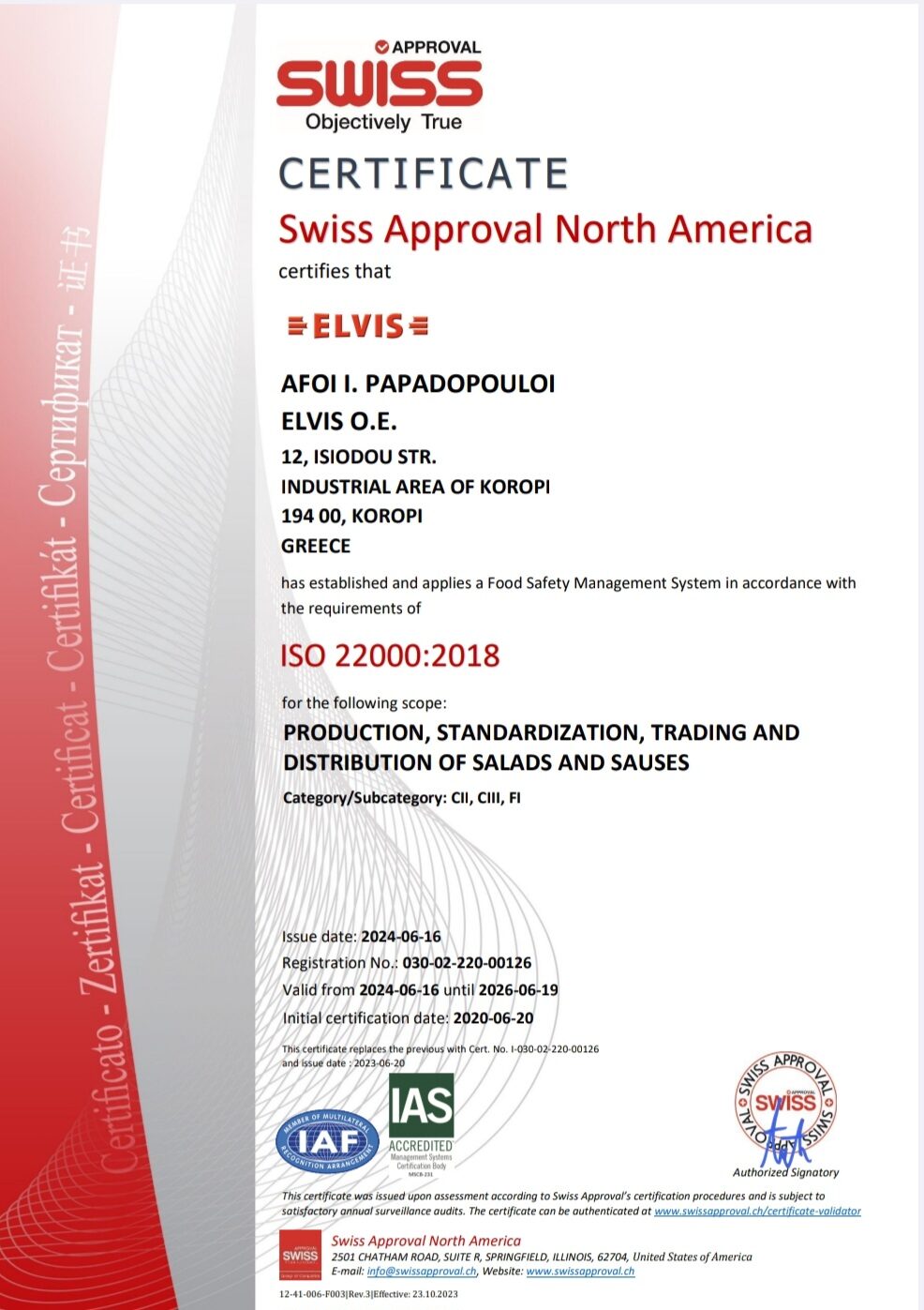Following a series of audits, ELVIS has been certified to have established and implemented a Quality Management System in accordance with the International Standard ISO 9001: 2015, as well as a Food Safety Management System in accordance with the International Standard ISO 22000: 2018.